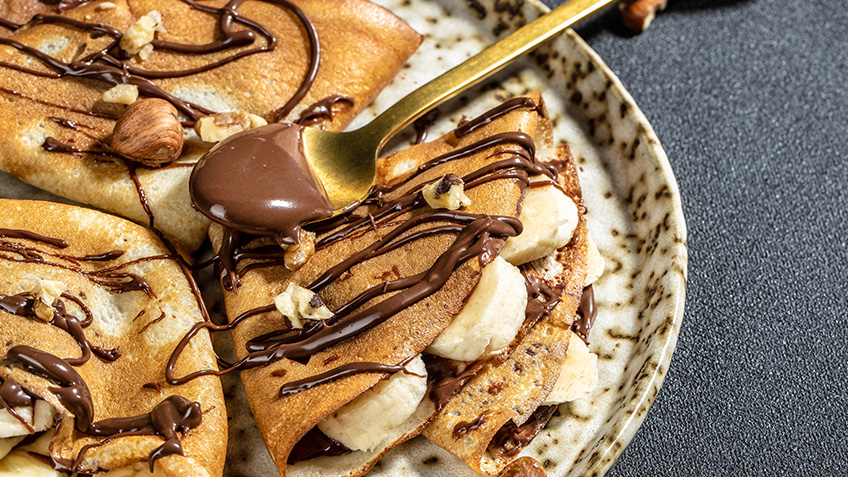 - Para el relleno untá crema de avellanas sobre el crepe caliente, agregá rodajas de banano y doblá en triángo o enrollá.