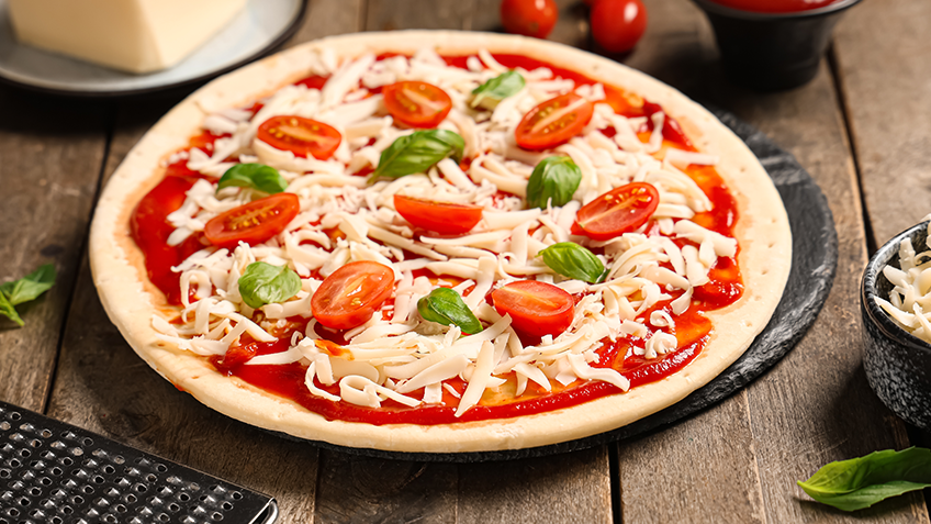- Untá la base con la salsa de tomate, colocá la mozzarella rallada encima y añadí rodajas de tomate fresco.