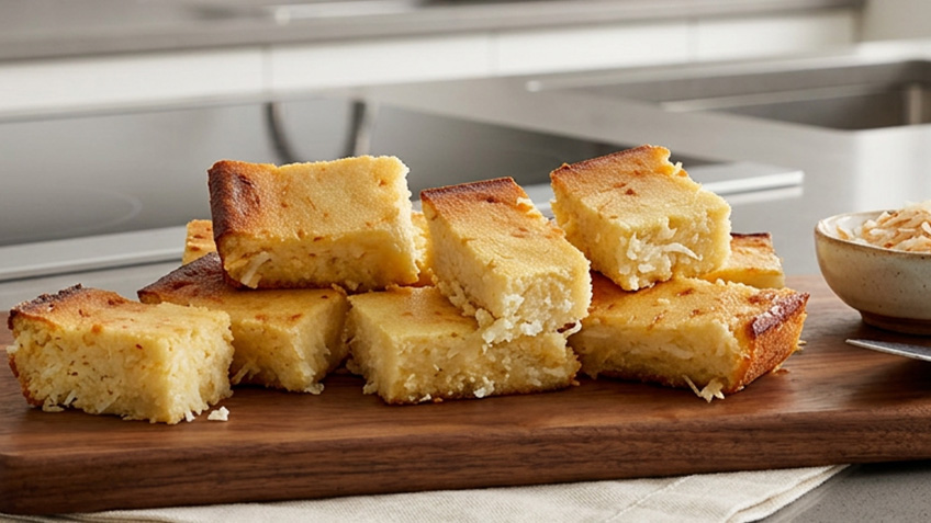 - Mezclá con masa, leche de coco, queso, azúcar y mantequilla.